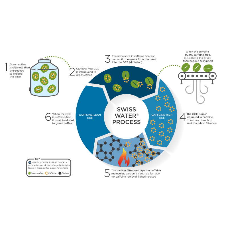 We opted for The Swiss Water Process to craft our amazing coffee without caffeine, keeping it chemical-free. All decaffeination processes are not created equal. The Swiss Water Process is certified organic, and it has always been committed to processing without added chemicals.